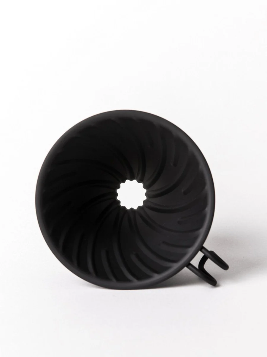 The metal filter cone of the V60 highlights the flavor-enhancing ribbing and aesthetic elegance of HARIOās exquisite, hand-pour coffee dripper.